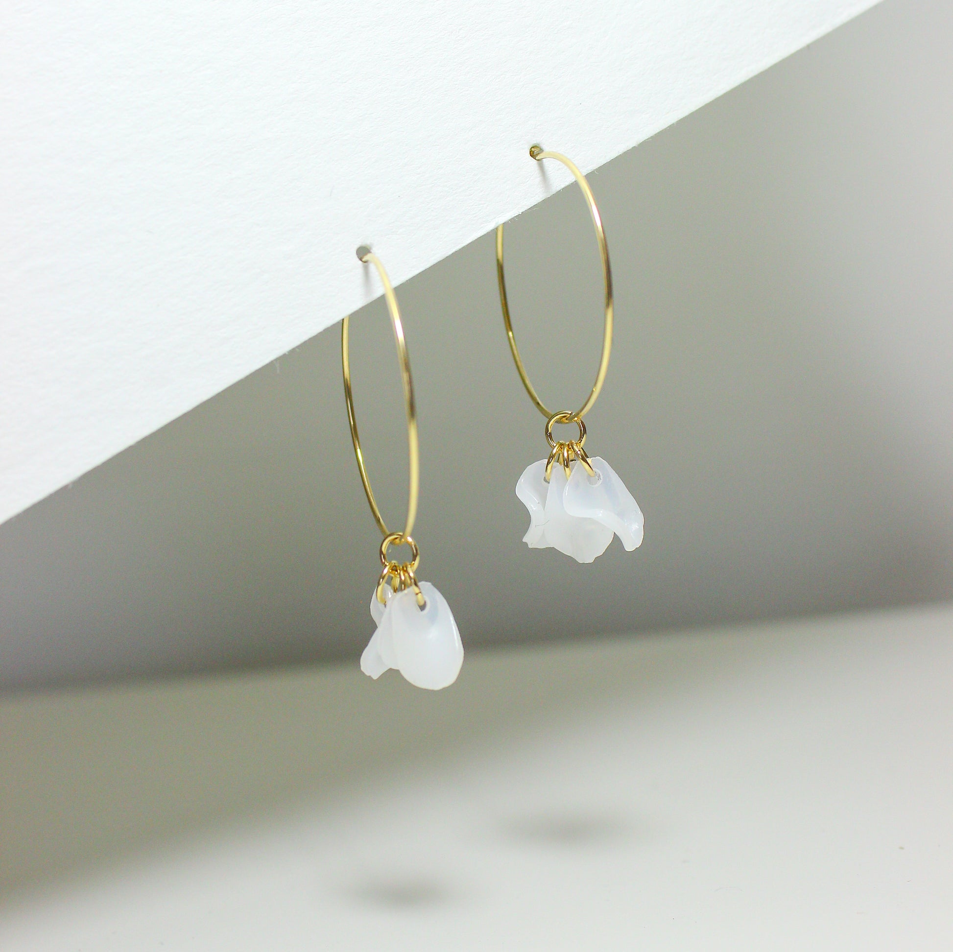Sustainable 14k gold filled hoops with white petals pendant. Also available in sterling silver. Handmade with recycled metals and upcycled bottles in Arlington, VA. Lightweight and versatile. Dimensions are 1x1.5 inches.