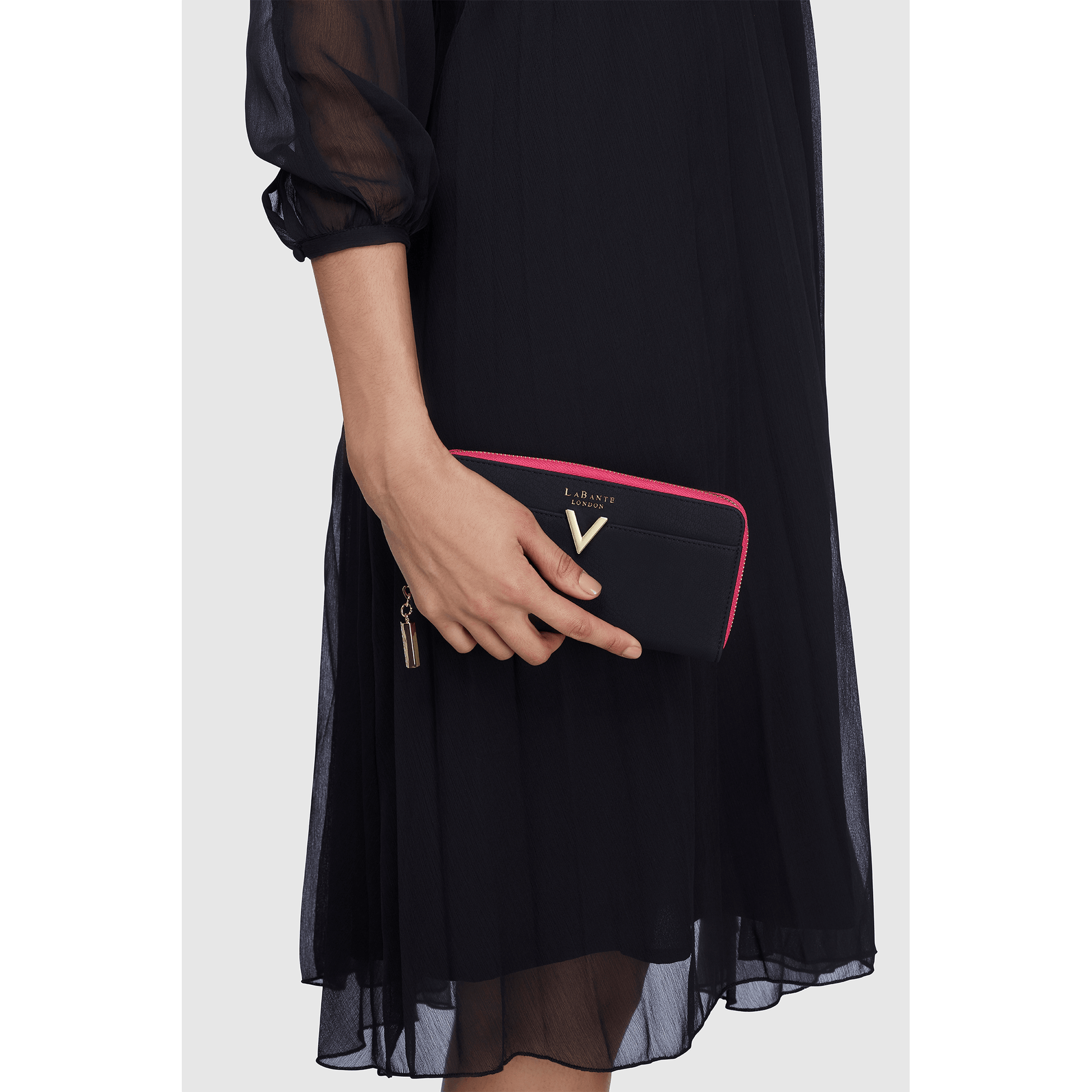 - A two-tone wallet crafted in a soft Napa faux leather with a distinctive v metal hardware. Featuring a contrast-coloured inner, foil LaBante London logo, metal zippers and multiple interior card slots.